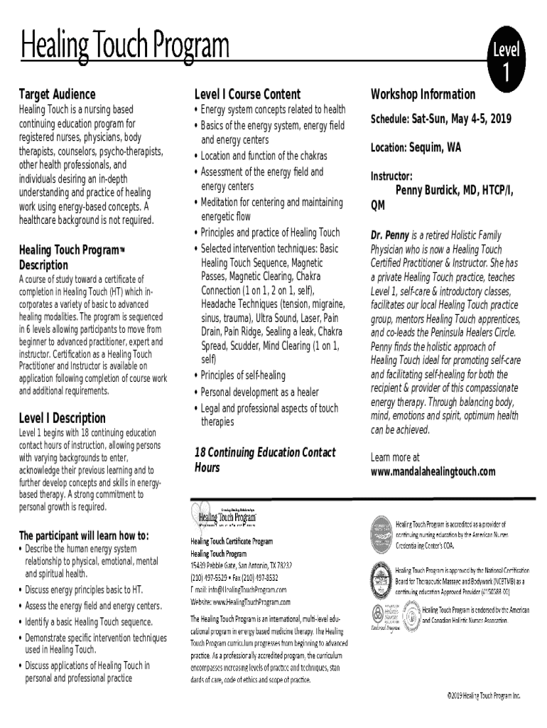 Frequently asked questions about Healing Touch is a nursing based continuing education program for registered nurses, physicians, body therapists, counselors, psycho-therapists, other health professionals, and individuals desiring an in-depth understanding and practice of healing wo template