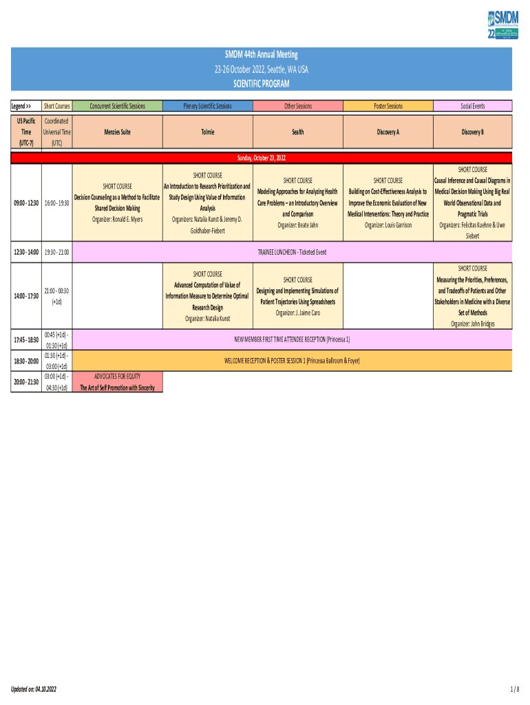 SMDM 44th Annual Meeting 2326 October 2022, Seattle, WA USA SCIENTIFIC PROGRAM Legend US Pacific Time (UTC7)Short CoursesConcurrent Scientific SessionsPlenary Scientific SessionsOther SessionsPoster