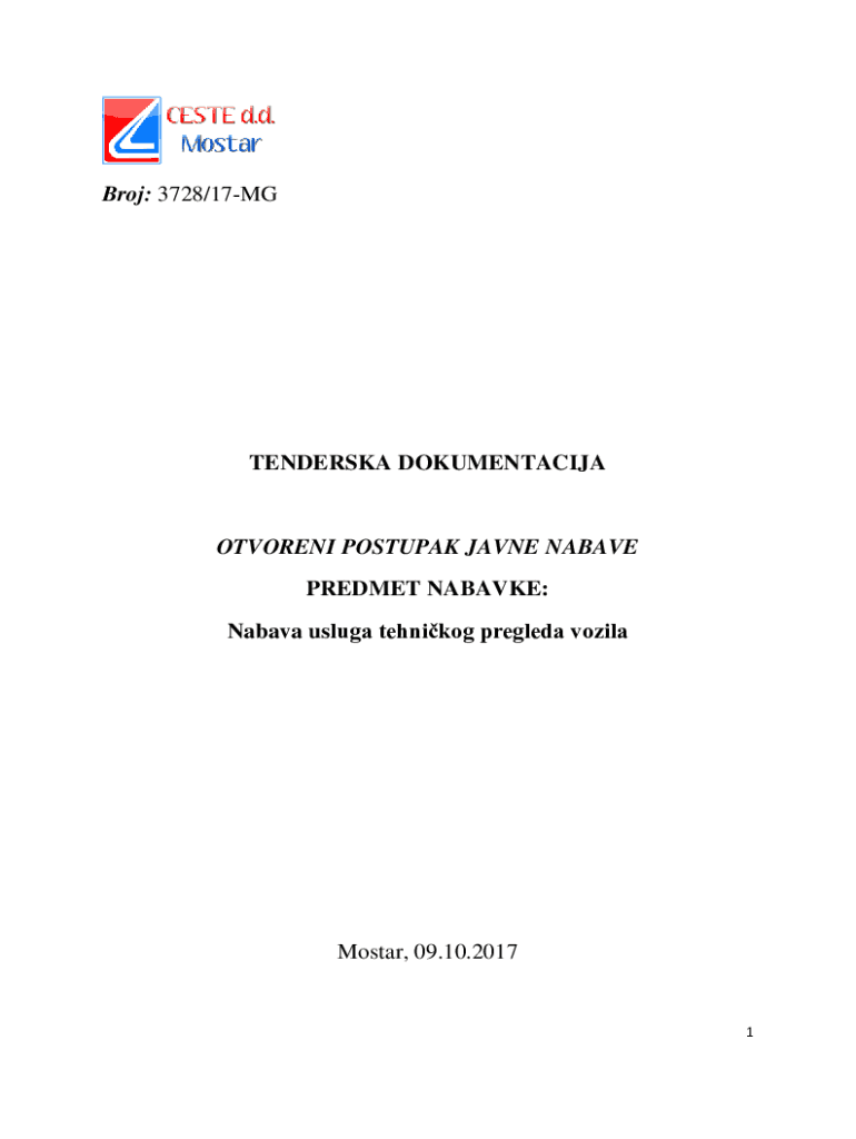 Broj: 3728/17MGTENDERSKA DOKUMENTACIJAOTVORENI POSTUPAK JAVNE NABAVE PREDMET NABAVKE: Nabava usluga tehnikog pregleda vozilaMostar, 09.10.201711.OPI PODACI1.1.PODACI O UGOVORNOM TIJELU Ugovorno tijelo: