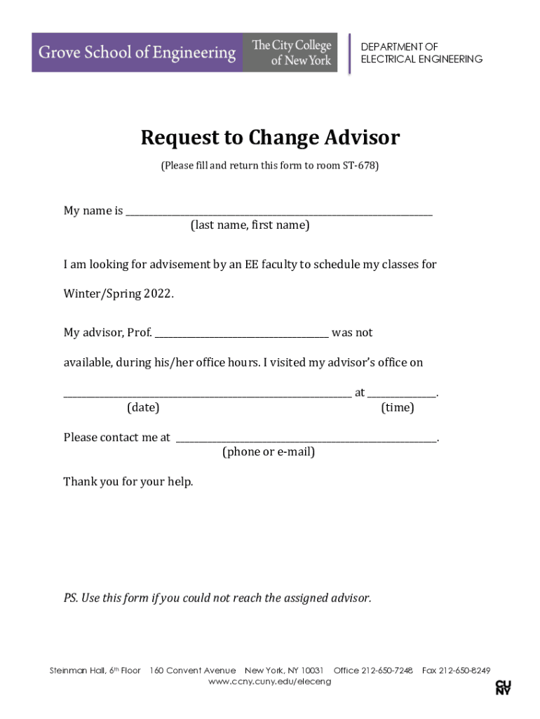 DEPARTMENT OF ELECTRICAL ENGINEERINGRequest to Change Advisor(Please fill and return this form to room ST678)My name is ___(last name, first name)I am looking for advisement by an EE faculty to schedule