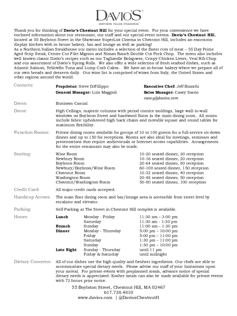 Thank you for thinking of Davios Chestnut Hill for your special event. For your convenience we have enclosed information about our restaurant, our staff and our special event menus. Davios Chestnut