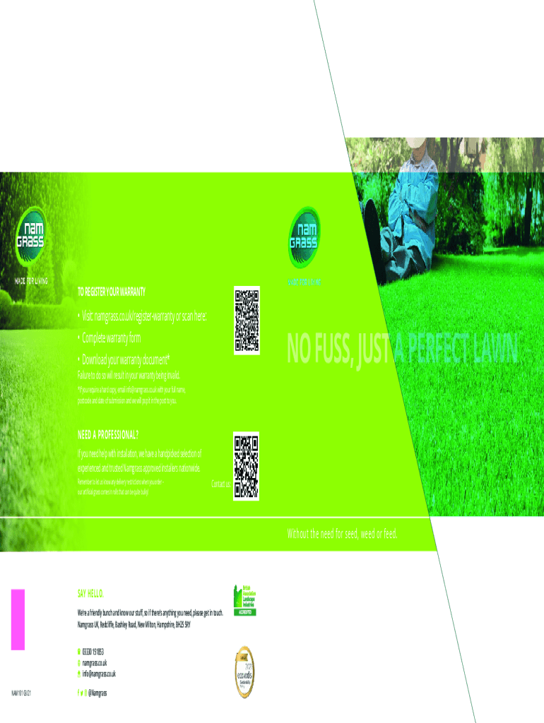 TO REGISTER YOUR WARRANTY Visit: namgrass.co.uk/registerwarranty or scan here:NO FUSS, JUST A PERFECT LAWN Complete warranty form Download your warranty document*Failure to do so will result in your