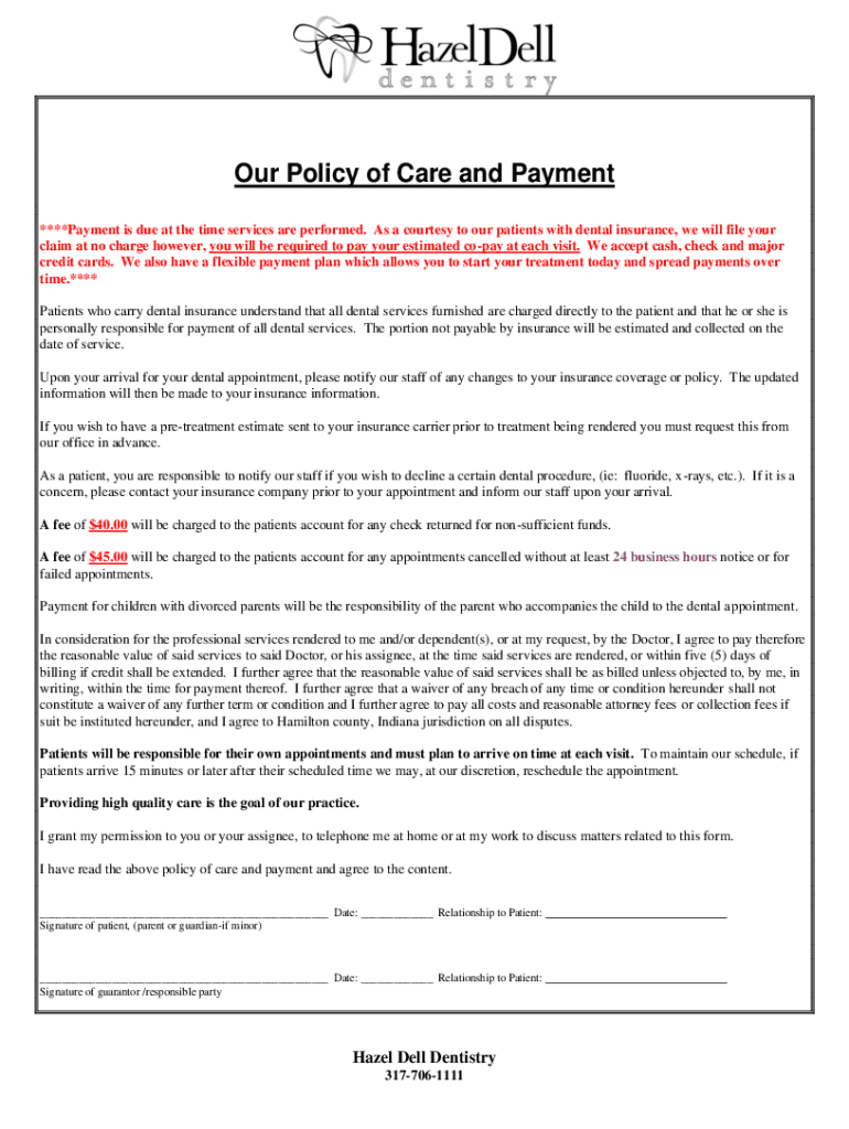 ****Payment is due at the time services are performed. As a courtesy to our patients with dental insurance, we will file your
