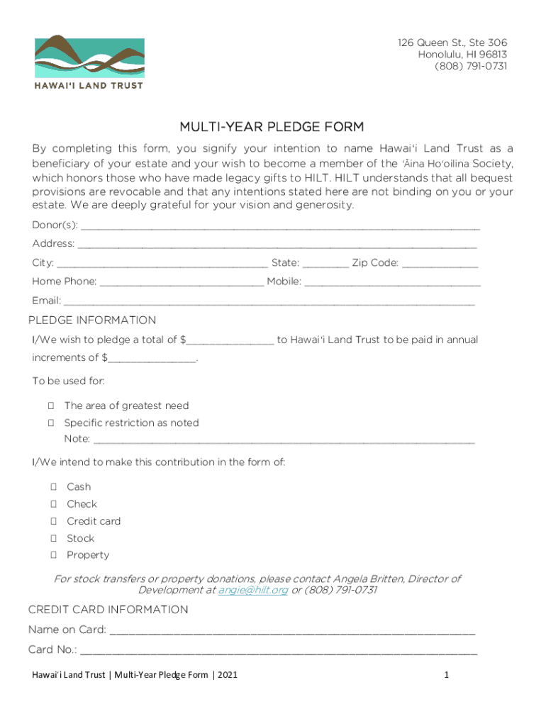 126 Queen St., Ste 306 Honolulu, HI 96813 (808) 7910731MULTIYEAR PLEDGE FORM By completing this form, you signify your intention to name Hawaii Land Trust as a beneficiary of your estate and your