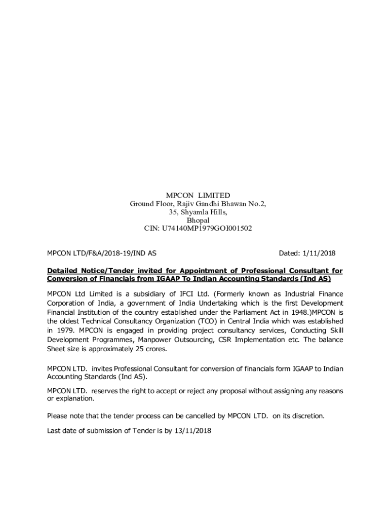 MPCON LIMITED Ground Floor, Rajiv Gandhi Bhawan No.2, 35, Shyamla Hills, Bhopal CIN: U74140MP1979GOI001502 MPCON LTD/F&A/201819/IND ASDated: 1/11/2018Detailed Notice/Tender invited for Appointment