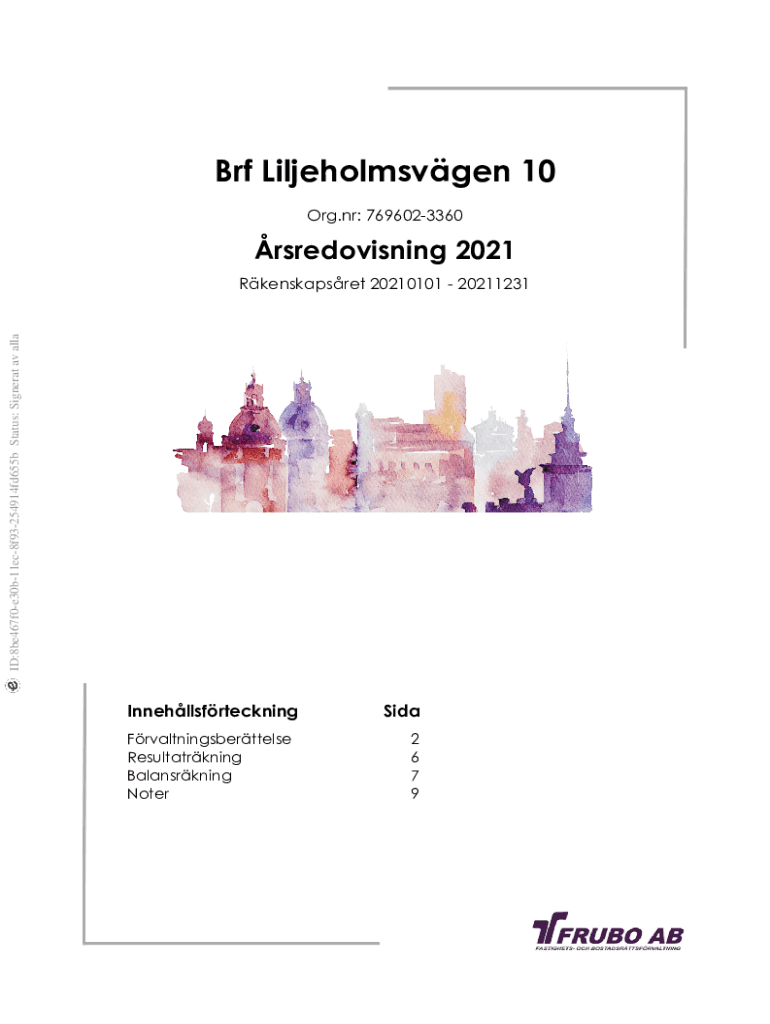 Brf Liljeholmsvgen 10 Org.nr: 7696023360rsredovisning 2021ID:8be467f0e30b11ec8f93254914fd655b Status: Signerat av allaRkenskapsret 20210101 20211231Innehllsfrteckning Frvaltningsberttelse Resultatrkning