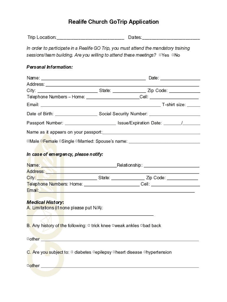Realife Church GoTrip Application Trip Location:___ Dates:___ In order to participate in a Realife GO Trip, you must attend the mandatory training sessions/team building. Are you willing to attend