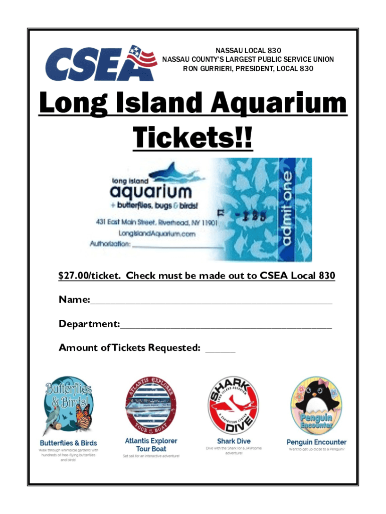 NASSAU LOCAL 830 NASSAU COUNTYS LARGEST PUBLIC SERVICE UNION RON GURRIERI, PRESIDENT, LOCAL 830Long Island Aquarium Tickets!!$27.00/ticket. Check must be made out to CSEA Local 830 Name:___ Department:___