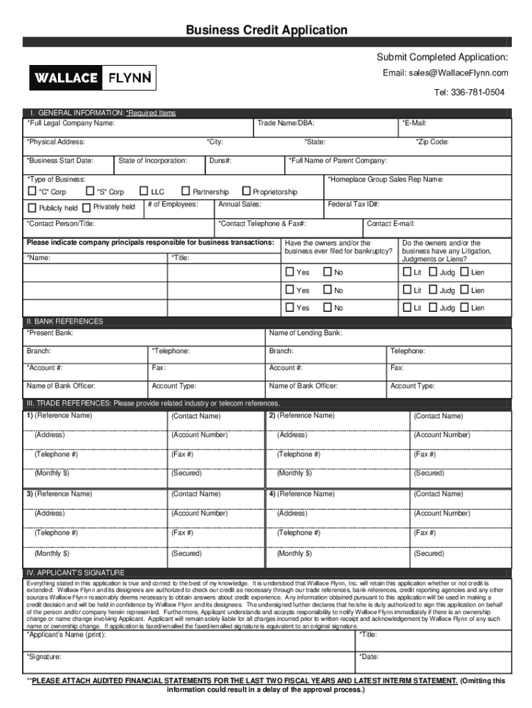 Business Credit Application Submit Completed Application: Email: sales@WallaceFlynn.com Tel: 3367810504 I. GENERAL INFORMATION: *Required Items *Full Legal Company Name:Trade Name/DBA:*Physical Address:*City:*Business