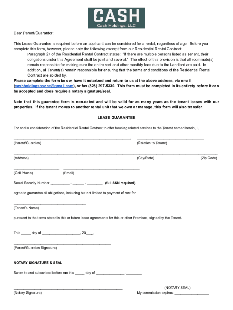 Dear Parent/Guarantor: This Lease Guarantee is required before an applicant can be considered for a rental, regardless of age. Before you complete this form, however, please note the following excerpt