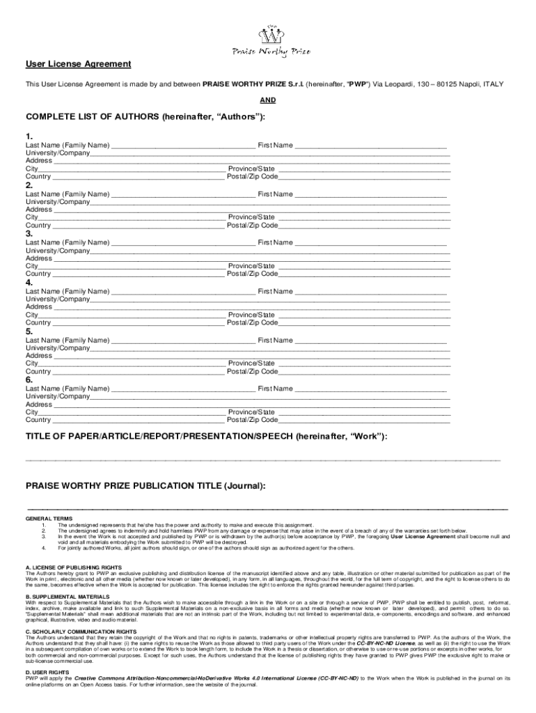 User License Agreement This User License Agreement is made by and between PRAISE WORTHY PRIZE S.r.l. (hereinafter, PWP) Via Leopardi, 130 80125 Napoli, ITALY ANDCOMPLETE LIST OF AUTHORS (hereinafter,