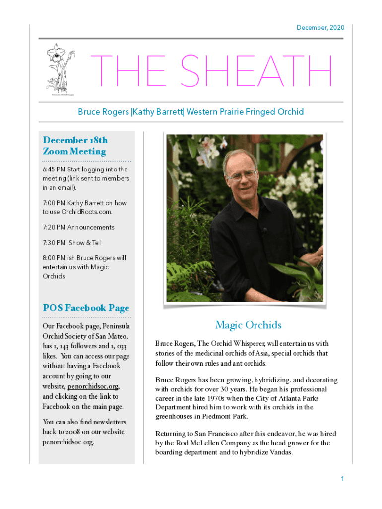 December, 2020THE SHEATH Bruce Rogers |Kathy Barrett| Western Prairie Fringed OrchidDecember 18th Zoom Meeting 6:45 PM Start logging into the meeting (link sent to members in an email). 7:00 PM Kathy