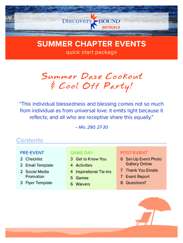 SUMMER CHAPTER EVENTS quick start packageSummer Daze Cookout & Cool Off Party! This individual blessedness and blessing comes not so much from individual as from universal love: it emits light because