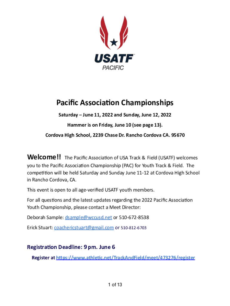Saturday June 11, 2022 and Sunday, June 12, 2022Hammer is on Friday, June 10 (see page 13). Cordova High School, 2239 Chase Dr. Rancho Cordova CA. 95670Welcome!!The Pacic Associa on of USA Track &