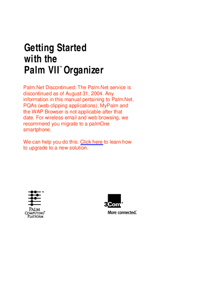 PalmVII GSround 91/25/99 9:20 PMPage 1Getting Started with the Palm VII Organizer Palm.Net Discontinued: The Palm.Net service is discontinued as of August 31, 2004. Any information in this manual