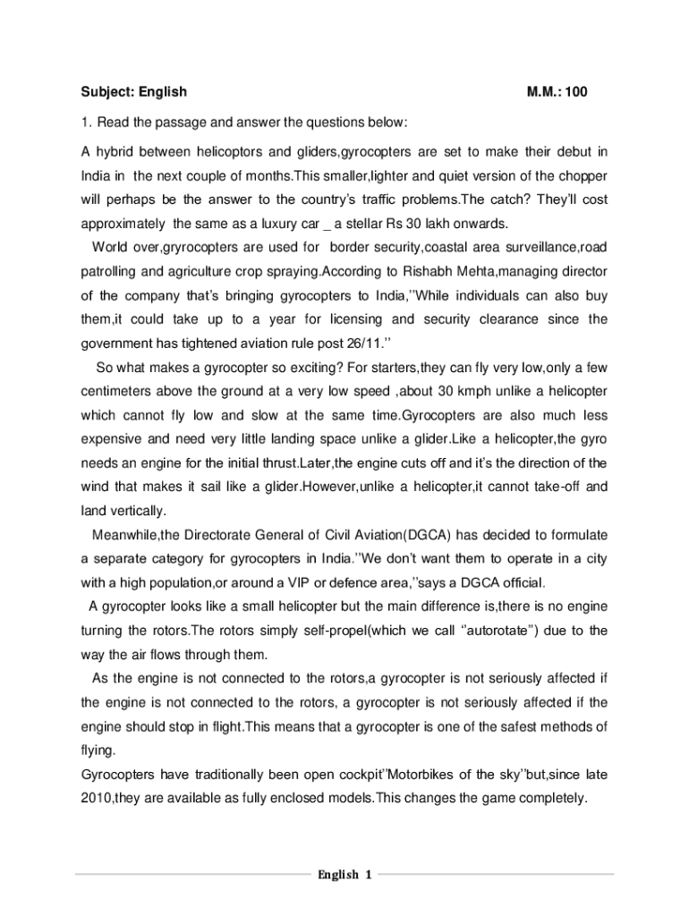 Subject: EnglishM.M.: 1001. Read the passage and answer the questions below: A hybrid between helicoptors and gliders,gyrocopters are set to make their debut in India in the next couple of months.This