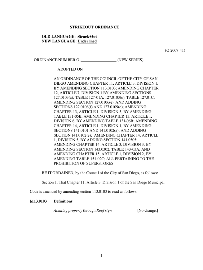 STRIKEOUT ORDINANCE OLD LANGUAGE: Struck Out NEW LANGUAGE: Underlined (O200741) ORDINANCE NUMBER O___ (NEW SERIES) ADOPTED ON ___ AN ORDINANCE OF THE COUNCIL OF THE CITY OF SAN DIEGO AMENDING CHAPTER