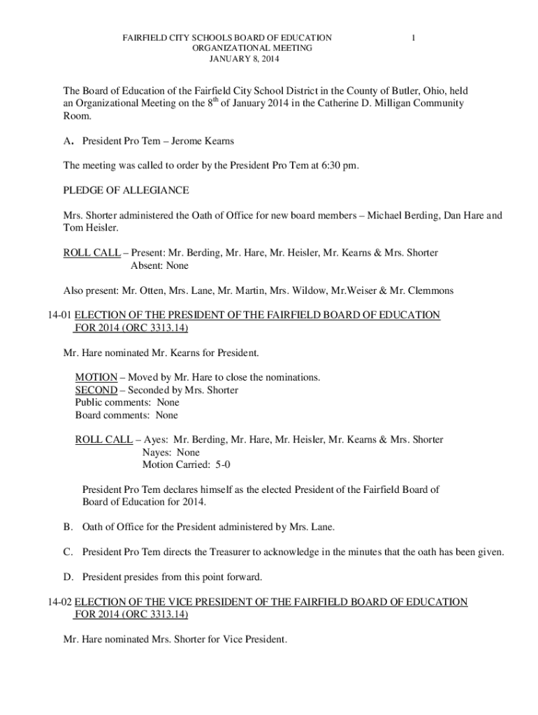 FAIRFIELD CITY SCHOOLS BOARD OF EDUCATION ORGANIZATIONAL MEETING JANUARY 8, 20141The Board of Education of the Fairfield City School District in the County of Butler, Ohio, held an Organizational