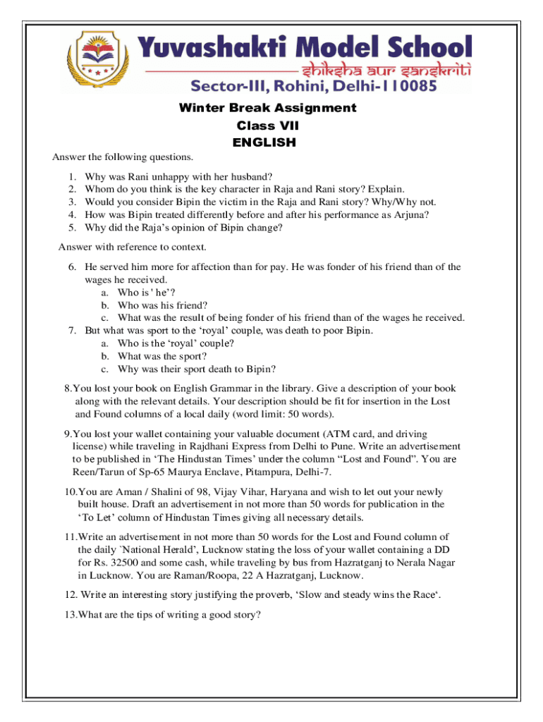 Winter Break Assignment Class VII ENGLISH Answer the following questions. 1. 2. 3. 4. 5.Why was Rani unhappy with her husband? Whom do you think is the key character in Raja and Rani story? Explain.