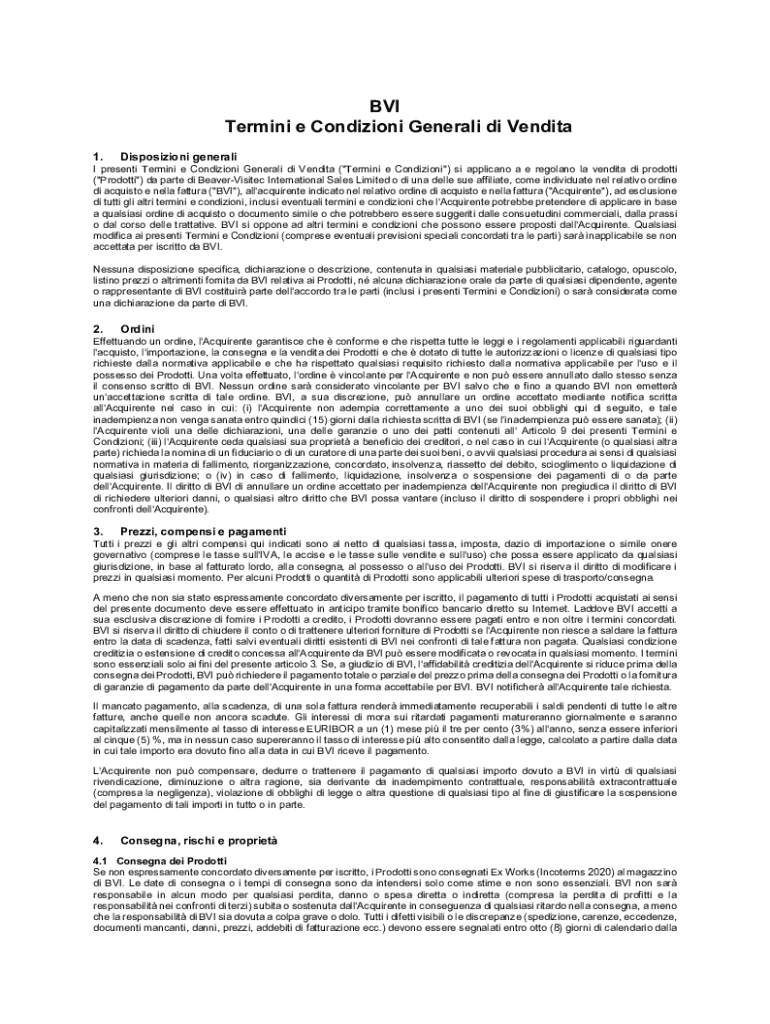BVI Termini e Condizioni Generali di Vendita 1.Disposizioni generaliI presenti Termini e Condizioni Generali di Vendita (\"Termini e Condizioni\") si applicano a e regolano la vendita di prodotti