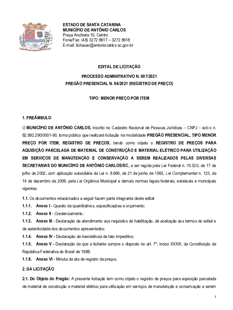 ESTADO DE SANTA CATARINA MUNICPIO DE ANTNIO CARLOS Praa Anchieta 10, Centro Fone/Fax: (48) 3272 8617 3272 8618 Email: licitacao@antoniocarlos.sc.gov.brEDITAL DE LICITAO PROCESSO ADMINITRATIVO N. 007/2021