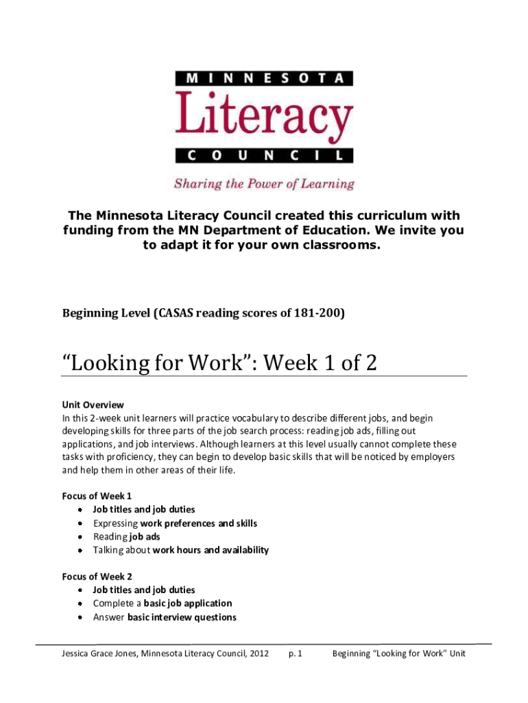 The Minnesota Literacy Council created this curriculum with funding from the MN Department of Education. We invite you to adapt it for your own classrooms.Beginning Level (CASAS reading scores of