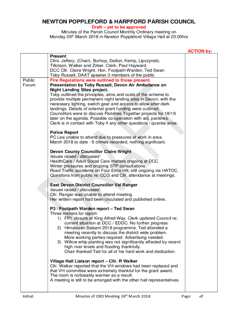 NEWTON POPPLEFORD & HARPFORD PARISH COUNCIL Draft yet to be approved Minutes of the Parish Council Monthly Ordinary meeting on Monday 26th March 2018 in Newton Poppleford Village Hall at 20.00hrsACTION