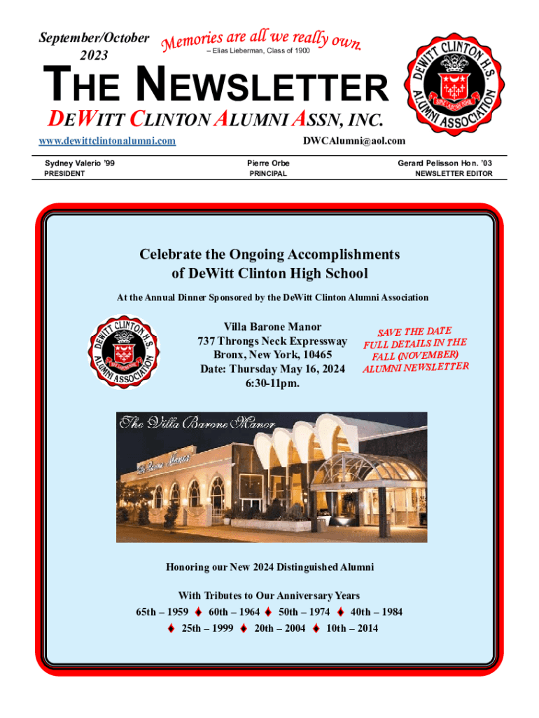 September/October 2023 Elias Lieberman, Class of 1900THE NEWSLETTER DEWITT CLINTON ALUMNI ASSN, INC.www.dewittclintonalumni.com Sydney Valerio 99PRESIDENTDWCAlumni@aol.comPierre OrbeGerard Pelisson