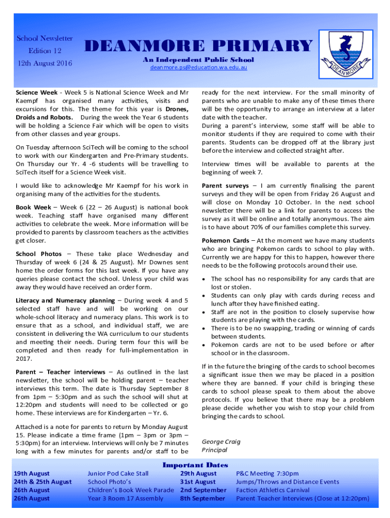 School Newsletter Edition 12 12th August 2016DEANMORE PRIMARY An Independent Public School deanmore.ps@education.wa.edu.auScience Week Week 5 is National Science Week and Mr Kaempf has organised many