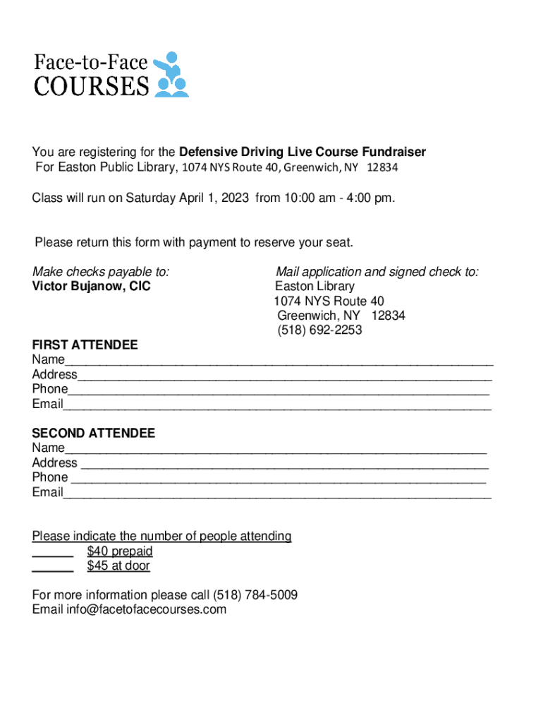 You are registering for the Defensive Driving Live Course Fundraiser For Easton Public Library, 1074 NYS Route 40, Greenwich, NY 12834 Class will run on Saturday April 1, 2023 from 10:00 am 4:00 pm.Please