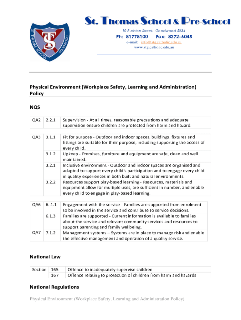 St. Thomas School & PreSchool 10 Rushton Street, Goodwood 5034Ph: 81778100Fax: 82726045email: info@stg.catholic.edu.au www.stg.catholic.edu.auPhysical Environment (Workplace Safety, Learning and Administration)