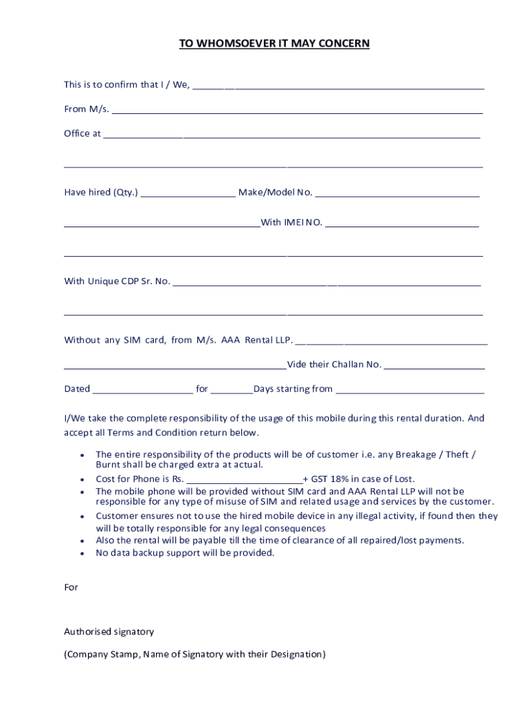 TO WHOMSOEVER IT MAY CONCERNThis is to confirm that I / We, ___ From M/s. ___ Office at ___ ___ Have hired (Qty.) ___ Make/Model No. ___ ___With IMEI NO. ___ ___ With Unique CDP Sr. No. ___ ___ Without