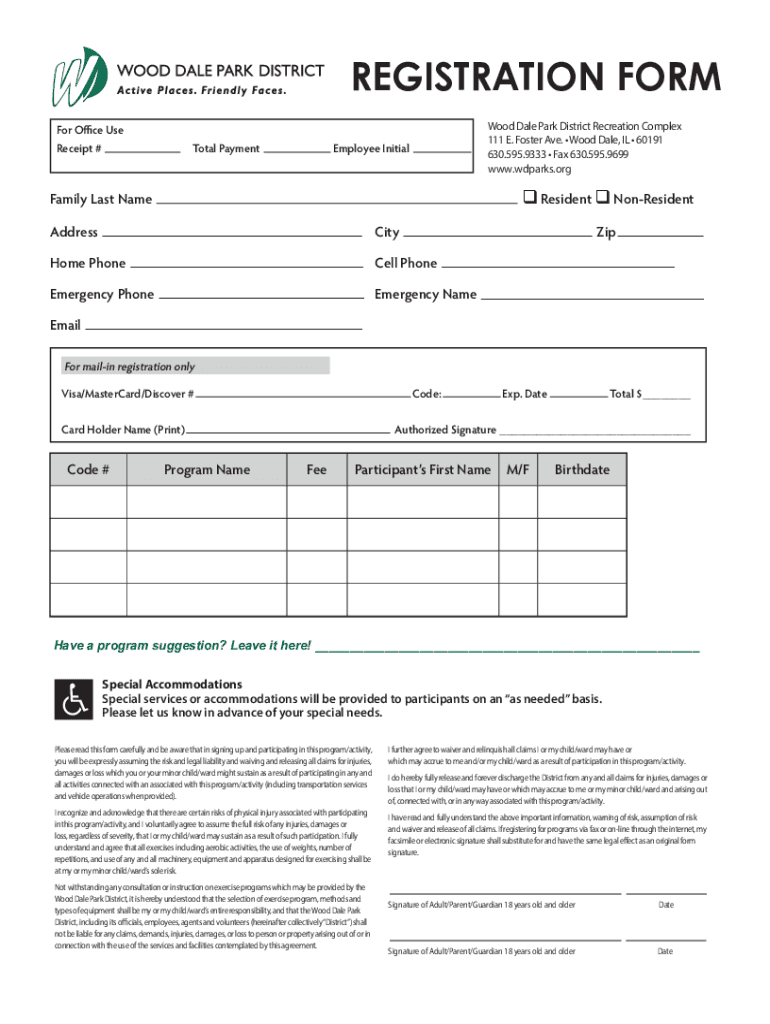 REGISTRATION FORM Wood Dale Park District Recreation Complex 111 E. Foster Ave. Wood Dale, IL 60191 630.595.9333 Fax 630.595.9699 www.wdparks.orgFor Office Use Receipt #Total PaymentEmployee Initial