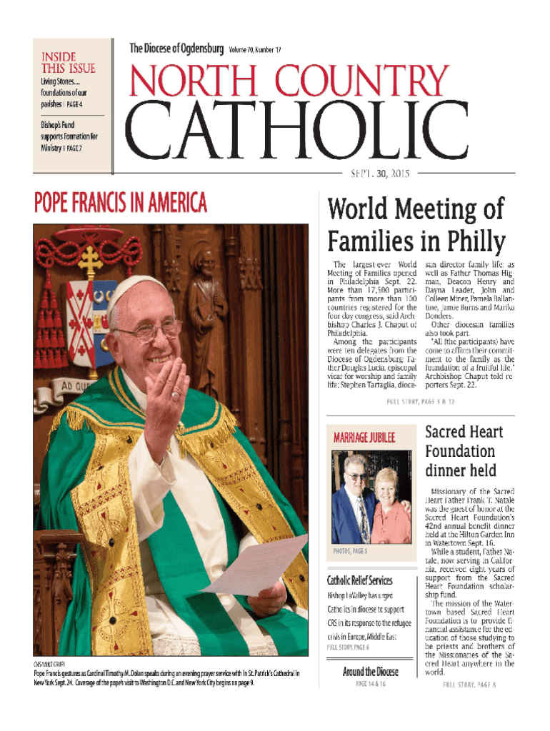 INSIDE THIS ISSUE living Stones.... foundations of our parishes I PAGE 4 Bishop\'s Fund supports Formation for Ministry I PAGE 7The Diocese of OgdensburgVolume 70, Number 17NORTH COUNTRYCATHOLIC SEPT.