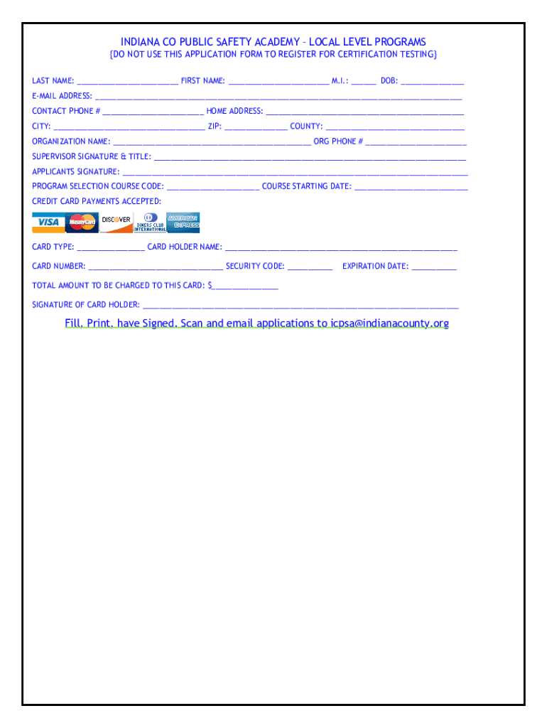 INDIANA CO PUBLIC SAFETY ACADEMY LOCAL LEVEL PROGRAMSDO NOT USE THIS APPLICATION FORM TO REGISTER FOR CERTIFICATION TESTING LAST NAME: ___ FIRST NAME: ___ M.I.: ___ DOB: ___ EMAIL ADDRESS: ___ CONTACT