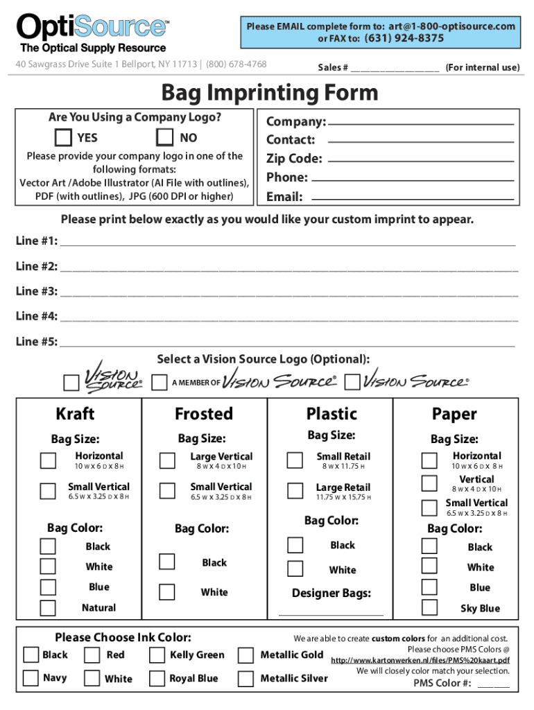 40 Saw grass Drive Suite 1 Bell port, NY 11713 | (800) 6784768Sales # ___ (For internal use)Bag Imprinting Form