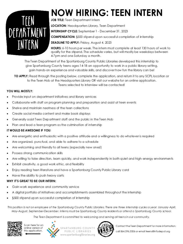 NOW HIRING: TEEN INTERN JOB TITLE: Teen Department Intern LOCATION: Headquarters Library, Teen Department INTERNSHIP CYCLE: September 1 December 31, 2023 COMPENSATION: $500 stipend upon successful