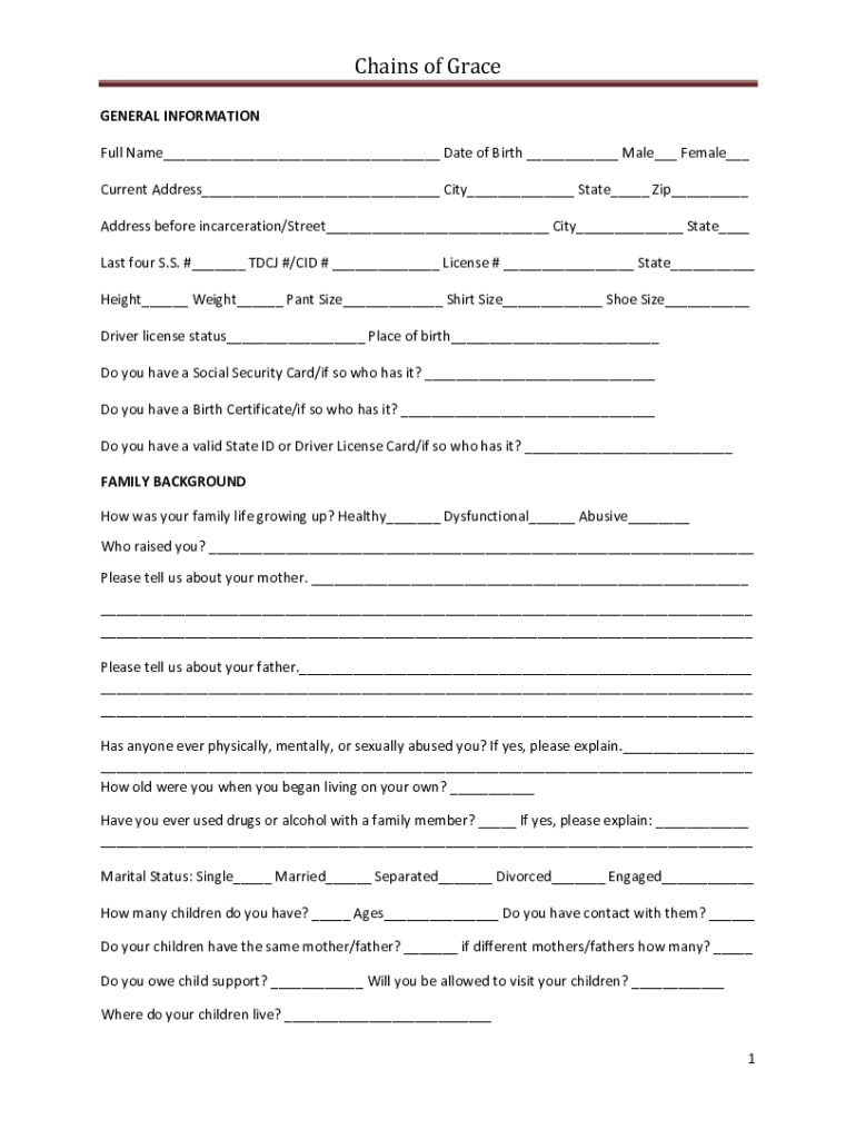 Chains of Grace GENERAL INFORMATION Full Name___ Date of Birth ___ Male___ Female___ Current Address___ City___ State___ Zip___ Address before incarceration/Street___ City___ State___ Last four S.S.