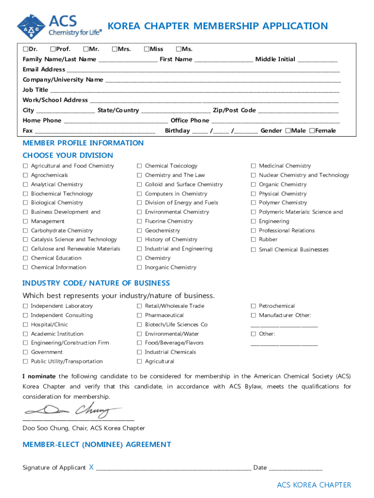 KOREA CHAPTER MEMBERSHIP APPLICATION Dr.Prof.Mr.Mrs.MissMs.Family Name/Last Name ___ First Name ___ Middle Initial ___ Email Address ___ Company/University Name ___ Job Title ___ Work/School Address