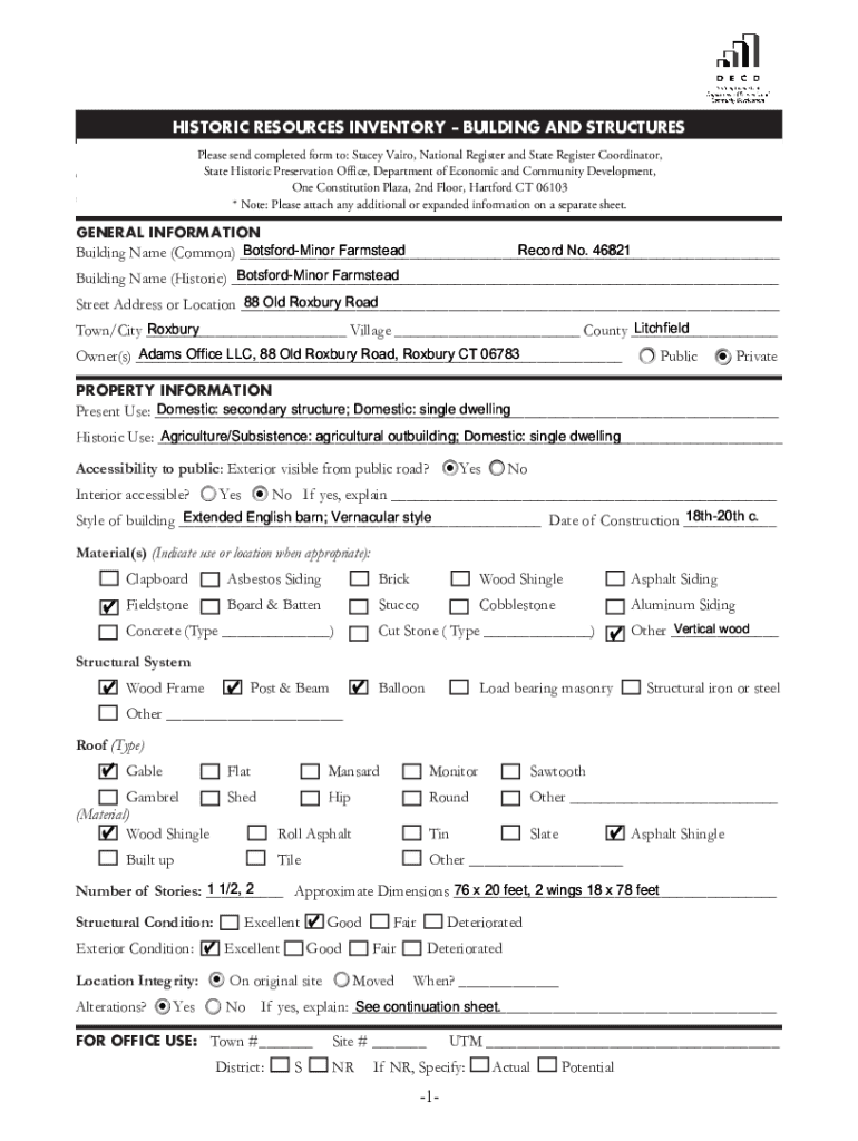 HISTORIC RESOURCES INVENTORY BUILDING AND STRUCTURES Please send completed form to: Stacey Vairo, National Register and State Register Coordinator, State Historic Preservation Office, One Department