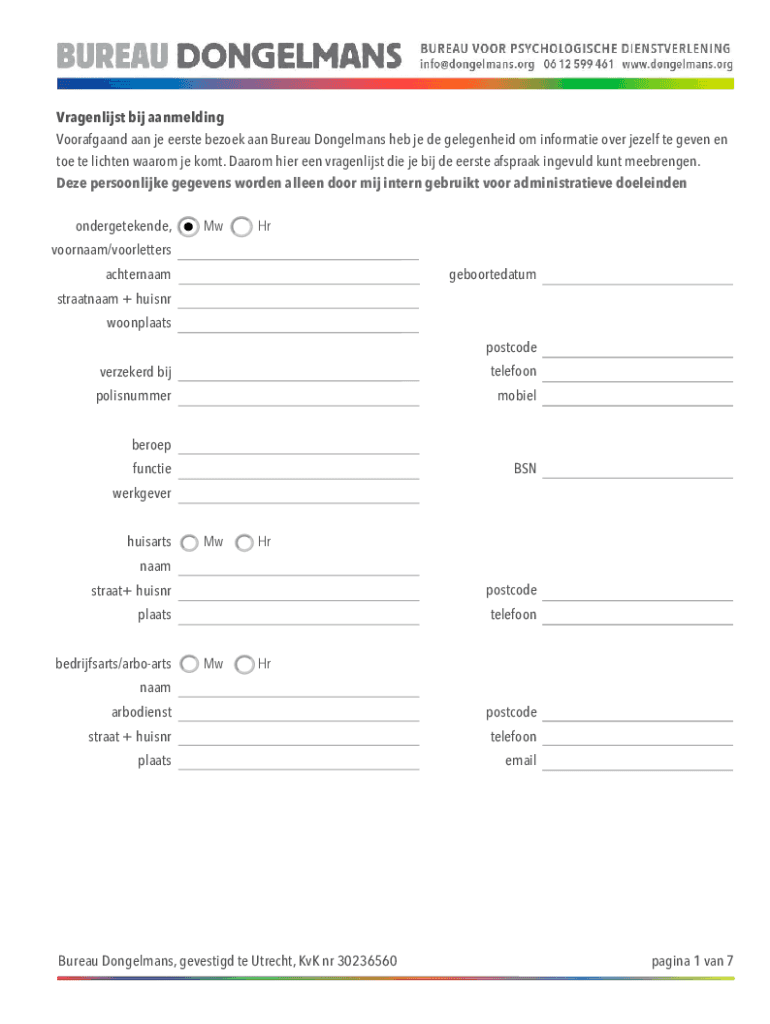 Vragenlijst bij aanmelding Voorafgaand aan je eerste bezoek aan Bureau Dongelmans heb je de gelegenheid om informatie over jezelf te geven en toe te lichten waarom je komt. Daarom hier een vragenlijst