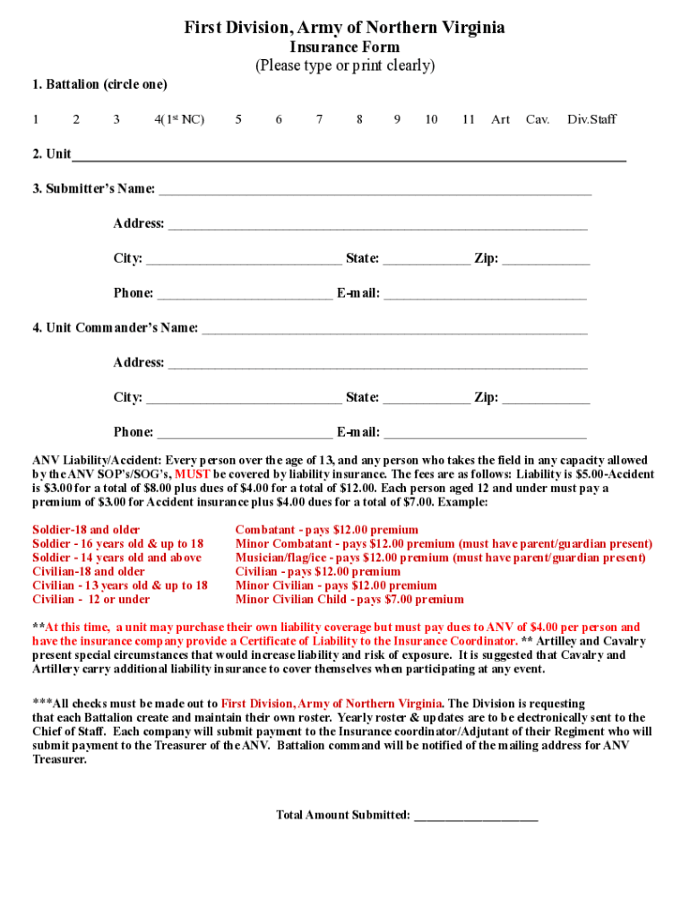 Insurance Form (Please type or print clearly) 1. Battalion (circle one) 1234(1st NC)567891011ArtCav.Div.Staff2. Unit___ 3. Submitters Name: ___ Address: ___ City: ___ State: ___ Zip: ___ Phone: ___
