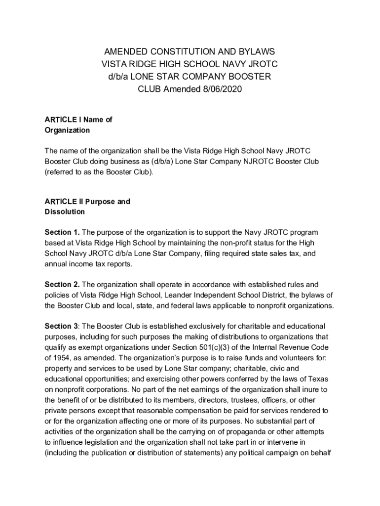 AMENDED CONSTITUTION AND BYLAWS VISTA RIDGE HIGH SCHOOL NAVY JROTC d/b/a LONE STAR COMPANY BOOSTER CLUB Amended 8/06/2020 ARTICLE I Name of Organization The name of the organization shall be the Vista