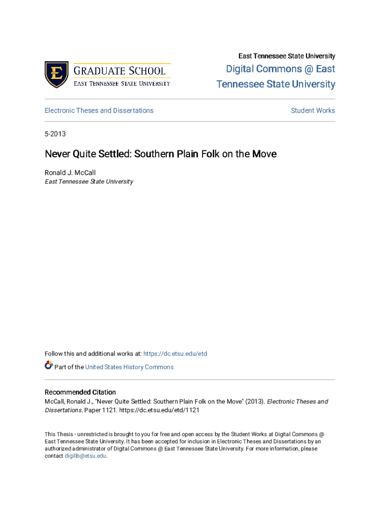East Tennessee State UniversityDigital Commons @ East Tennessee State University Electronic Theses and DissertationsStudent Works52013Never Quite Settled: Southern Plain Folk on the Move Ronald J.