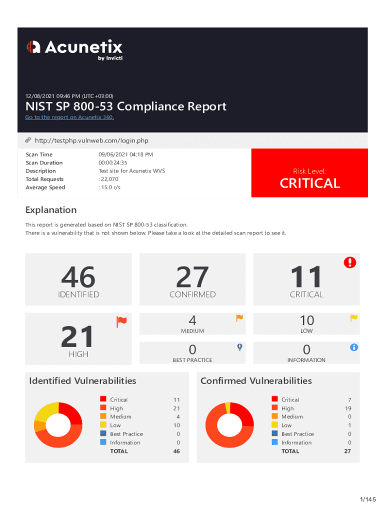 12/08/2021 09:46 PM (UTC+03:00)NIST SP 80053 Compliance Report Go to the report on Acunetix 360.http://testphp.vulnweb.com/login.php Scan Time09/06/2021 04:18 PMScan Duration Description Total Requests00:00:24:35