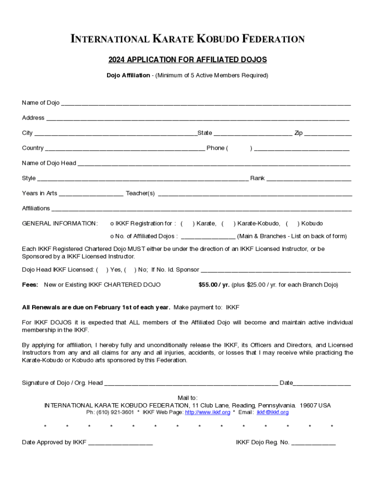 INTERNATIONAL KARATE KOBUDO FEDERATION 2024 APPLICATION FOR AFFILIATED DOJOS Dojo Affiliation (Minimum of 5 Active Members Required)Name of Dojo ___ Address ___ City ___State ___ Zip ___ Country ___