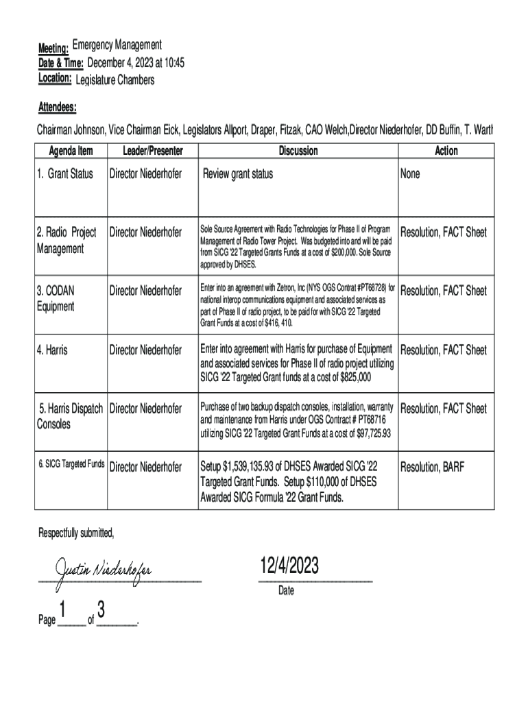 Meeting: Emergency Management Date & Time: December 4, 2023 at 10:45 Location: Legislature Chambers Attendees:Chairman Johnson, Vice Chairman Eick, Legislators Allport, Draper, Fitzak, CAO Welch,Director