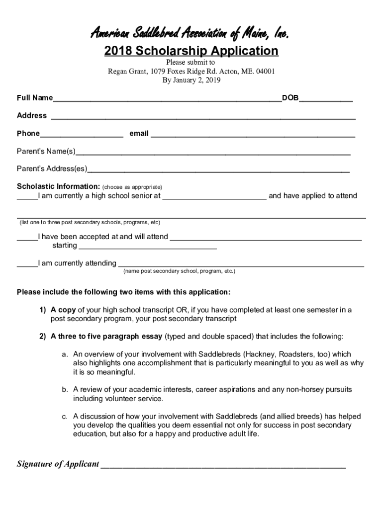 American Saddlebred Association of Maine, Inc. 2018 Scholarship Application Please submit to Regan Grant, 1079 Foxes Ridge Rd. Acton, ME. 04001 By January 2, 2019 Full Name___DOB___ Address ___ Phone___