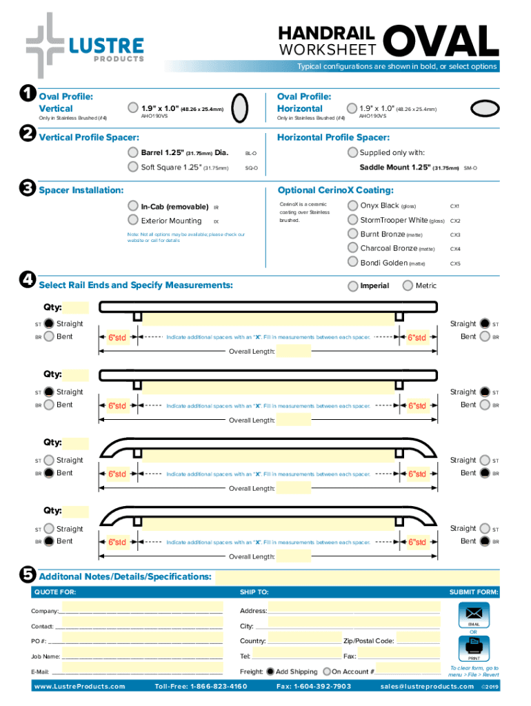 HANDRAILWORKSHEETOVALTypical configurations are shown in bold, or select options1Oval Profile: VerticalAHO190VSOnly in Stainless Brushed (#4)2 3Oval Profile: Horizontal1.9\" x 1.0\" (48.26 x 25.4mm)1.9\"