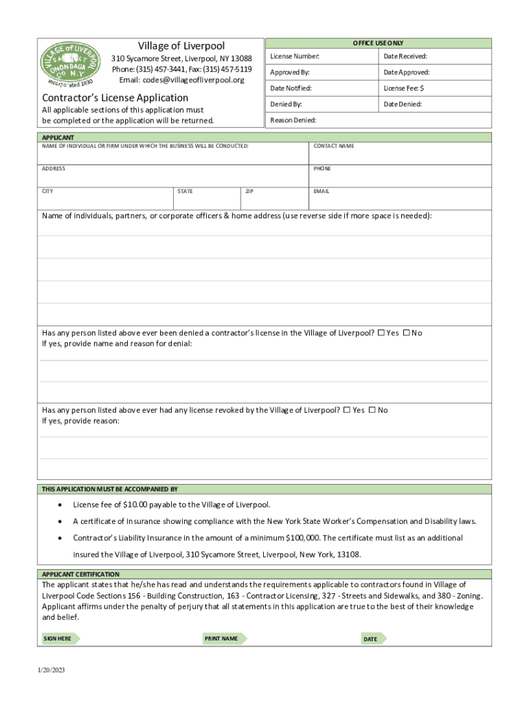 Village of Liverpool. OFFICE USE ONLY310 Sycamore Street, Liverpool, NY 13088 Phone: (315) 4573441, Fax: (315) 4575119 Email: codes@villageofliverpool.orgContractors License Application All applicable